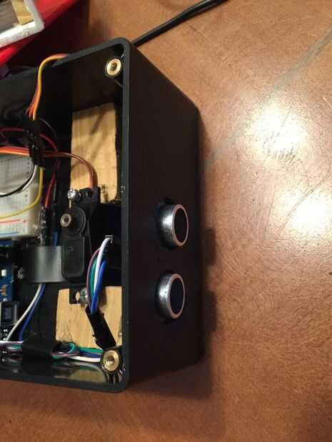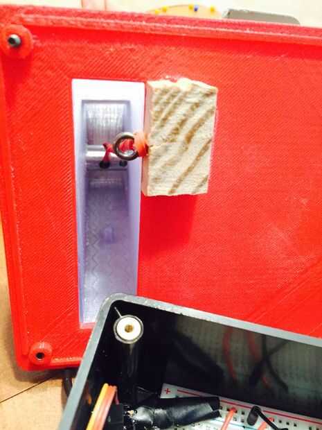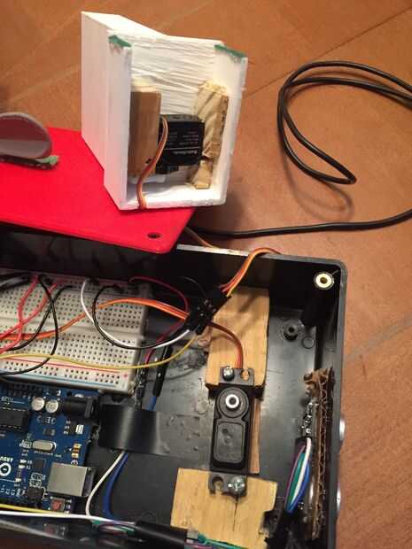 Ahora solo puedes poner la parte superior detrás de la caja, asegurándose de que los cables están en los lugares correctos y luego empuje el cuerno del servo (que se pega al depósito) en el servo dentro de la caja.