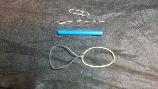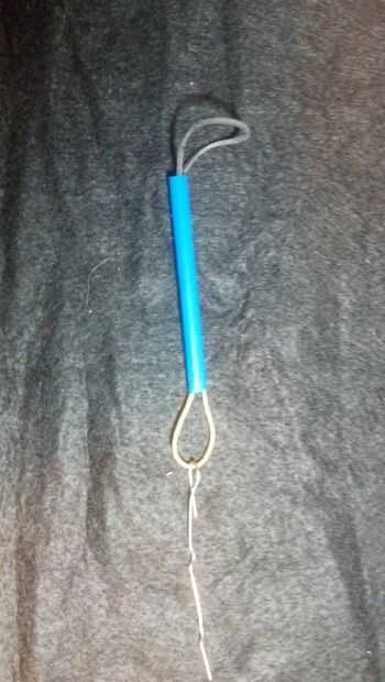1. Tomar el clip de papel y doblarla como se muestra (recto con un gancho en el extremo). Utilice esto para rubber band(s) a través de la paja (que se corta a la longitud de la bobina de bolsa - 2 5/8" en mi caso) del hilo de rosca