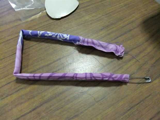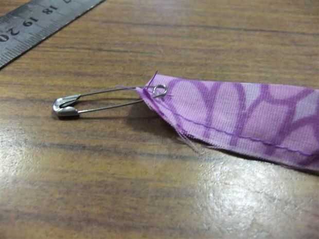 Vuelta adentro hacia fuera como sigue: Coloque el pasador de seguridad a un lado de uno de los extremos. El pasador de la vuelta y ponerlo en la apertura. Empuje a la tela a lo largo de la espiga, sostenga la cabeza del perno dentro de la tela y tire de la tela se reunieron el extremo - esto puede ser un poco difícil. Una vez el perno llegue al final te puede tirar hacia fuera y continuar invirtiendo el tubo.