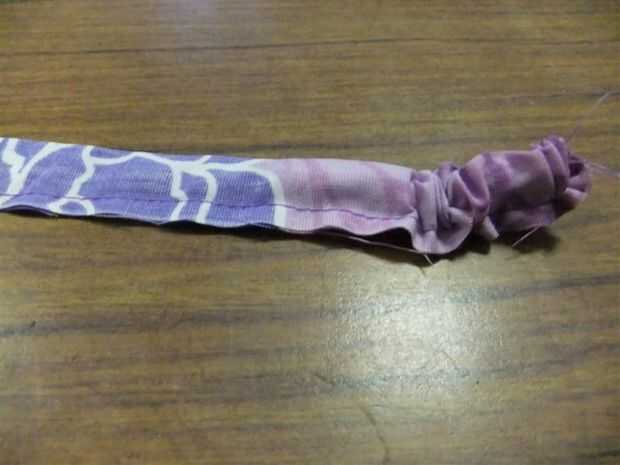 Cortar un trozo de tela de unos 3 cm (poco más de una pulgada) de ancho. Doblar por la mitad y coser los lados junto con como pequeño una costura puede llegar a hacer un tubo delgado.