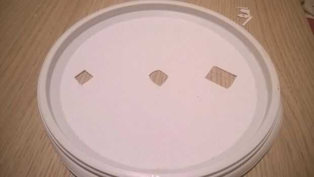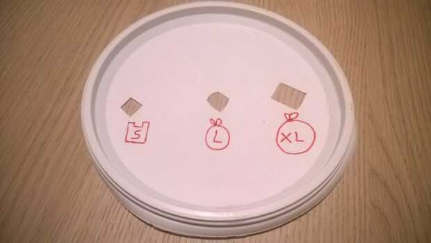 medir el centro de cada compartimento de la cubeta y medida sobre la tapa. Hacer agujeros cuadrados con la herramienta de corte, de mayor o menor tamaño dependiendo del grosor de las bolsas. El agujero debe ser claro, más su equipaje será rasgado...