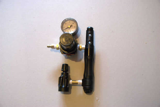 Tengo un tanque de CO2 de 5 libras que utilizo para dispensar cerveza de mi Kegerator, pero es forma grande y pesado para llevar a una fiesta.También se puede utilizar un tanque de CO2 de 20 oz paintball, conectado a un regulador de CO2 normal. Esto