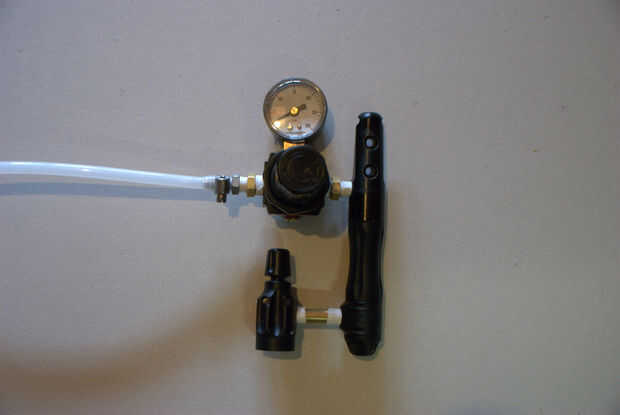 Tengo un tanque de CO2 de 5 libras que utilizo para dispensar cerveza de mi Kegerator, pero es forma grande y pesado para llevar a una fiesta.También se puede utilizar un tanque de CO2 de 20 oz paintball, conectado a un regulador de CO2 normal. Esto