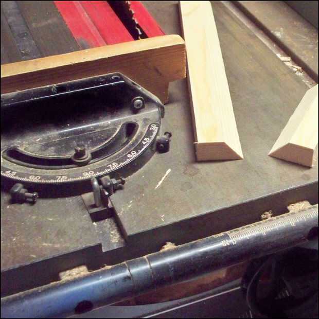 Un pedazo de madera se corta en un ángulo como se muestra en la Sierra de mesa.  Cortar una pieza que encaja las piezas laterales de la cubeta.