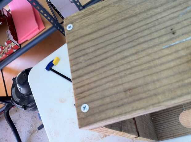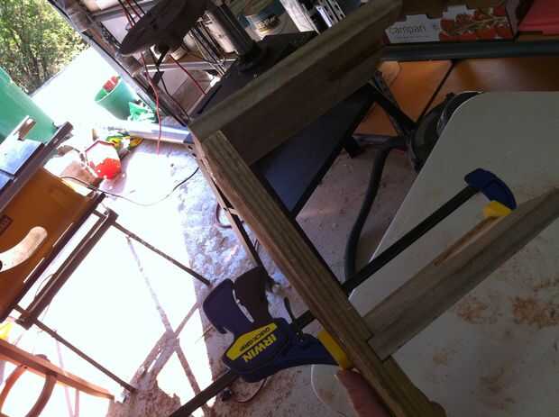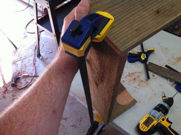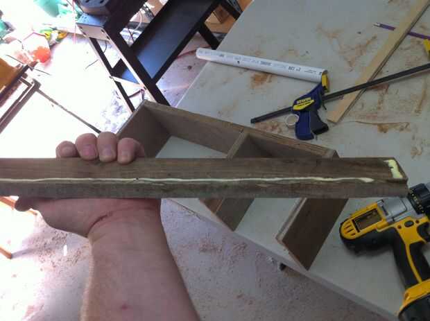 Ahora, todos a la vez o en etapas utilice pegamento para madera, pinzas y unos tornillos (pretaladrados!) estratégicamente situados para montar la parte inferior, lados, pieza media y posterior. NO pegar en la pieza frontal todavía, (no han hecho todavía, pero por si acaso tienes por delante...) primero tienes que poner el borde de corte de cinta en él.