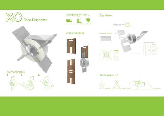 La forma del dispensador de cinta XO está inspirada en el cruce de caminos para crear una intersección. El dispensador está diseñado para una óptima funcionalidad y uso mínimo de energía y material en la fabricación y el envasado.