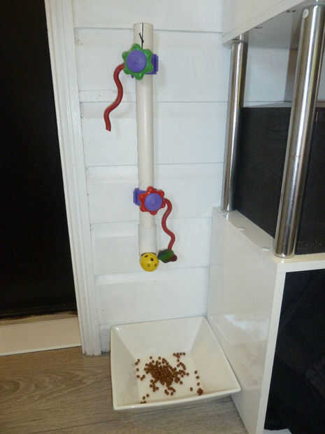 Esta es una tabla de alimentación para gatos - pones golosinas entre los obstáculos para el gato a pescar, es bastante straighforward realmente. Pueden ser construido de cualquier piezas de madera pueden ser sobrantes de proyectos anteriores. No reco