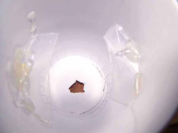 Con las tijeras cortadas dos piezas de plástico y pegamento en los lados opuestos al interior de la taza. Asegúrese de que sea lo suficientemente grande como para un tubo de pasta dental podría caber en él.  Ahora tiempo para prepararse para el siguiente paso!
