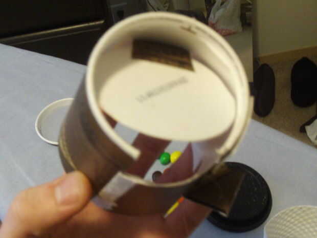 6. Tome la pieza que primero cortamos de la taza grande. Lugar en la Copa del alto desgaste del agujero sería. Si no tienes un gráfico en su taza podría omitir este paso.