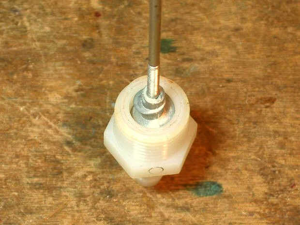 El eje es una varilla de 1/8" a 5" de largo. Hilos de rosca se utilizan en un solo extremo. 1/8" tornillo funcionará OK. Compre un pedazo más largo y recortar para ajustarse. (Será recortar la longitud de un paso más adelante.)