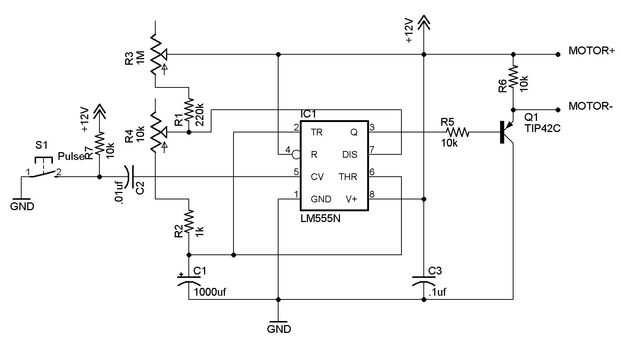 Q1 puede ser cualquier transistor de potencia PNP que controlará la corriente del motor y voltaje. Ajuste los valores de resistencia (R5 y R6) para que coincida con las especificaciones del transistor. Siempre use un disipador de calor adecuado.