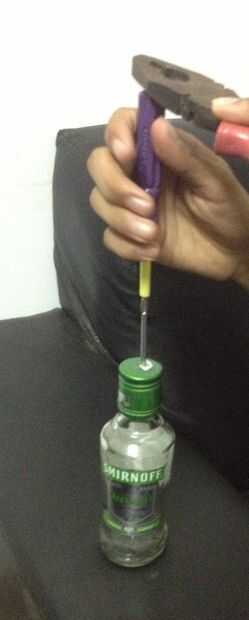 - Como en la imagen, puse un destornillador de puntas en el centro de la tapa de la botella y golpeado con algo duro (usé los alicates).
