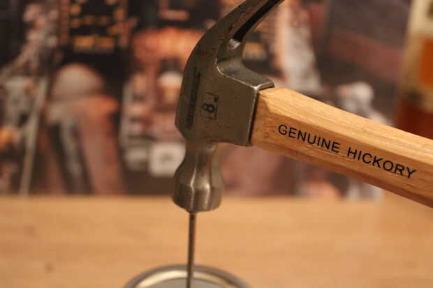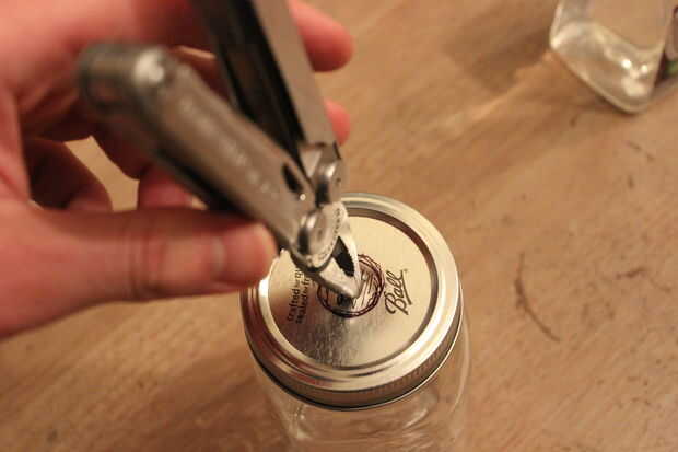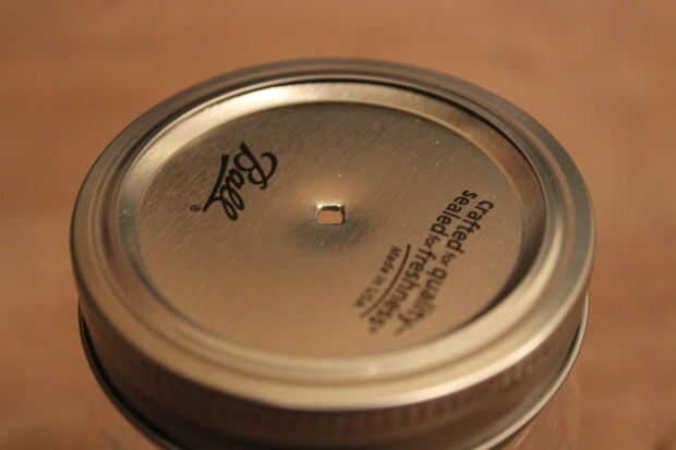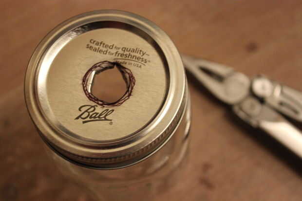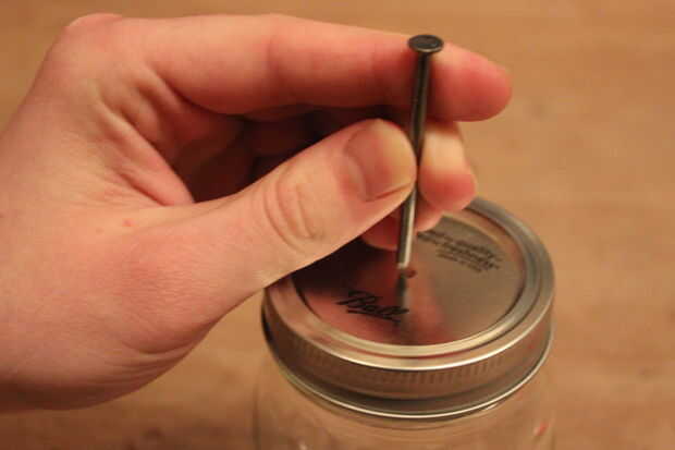 Primero marque el centro de la tapa del tarro de masón. Agarrar un martillo y un medio de tamaño del clavo. Agarre la parte superior de la jarra y el clavo con una mano. Asegúrese de que el clavo está alineado en el centro. Ahora tome un martillo y golpee el clavo en la parte superior de la tapa, sólo debe tomar unos hits pop el clavo a través de. Dado en el clavo medio camino a través de la tapa y luego retírela.