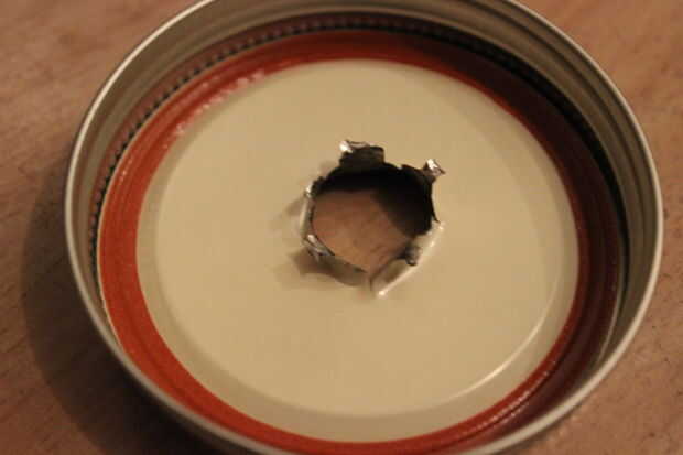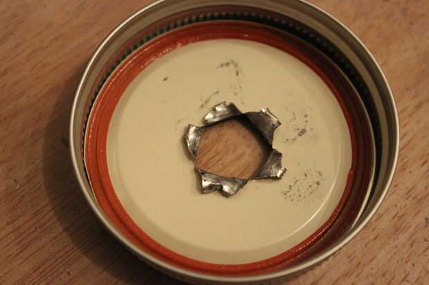 Una vez que el tamaño del agujero derecho Desenroscar y estallido de la tapa. Dale la vuelta en la superficie de trabajo y usted verá que algunos irregulares metal aletas asomando. Empujando desde el interior del agujero hacia fuera, doble las aletas para que queden al ras con la parte inferior de la tapa. Tenga cuidado alrededor de los bordes superiores de las aletas del agujero, cosas afiladas cortan.