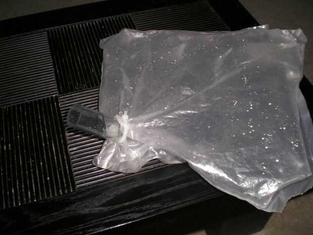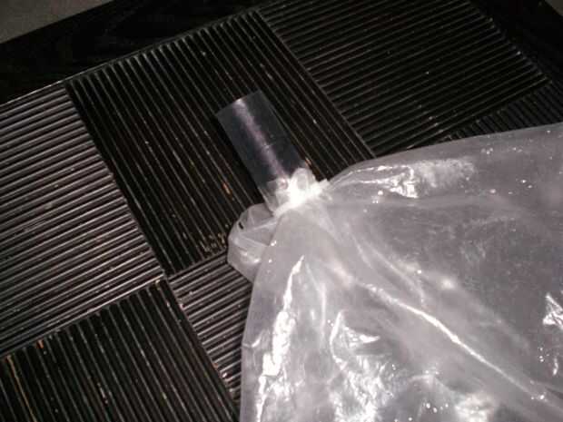 Este también es un procedimiento delicado, que desee asegurarse de que el tubo no sube demasiado alto o abajo if demasiado baja, usted está colocando por debajo de una torre de cerveza. Así que primero necesita averiguar donde el tubo tiene que salir de la calabaza para descansar justo debajo del grifo de cerveza. Ahora corte un agujero en la bolsa, en el extremo opuesto de la boquilla. Coloque el tubo en, no permitiendo más de un par de pulgadas a ir en la bolsa (puede que tenga que cortar el tubo a medida). Fije el tubo dentro de la bolsa con el cintillo plástico (ver fotos). Ahora usted tiene una bolsa que puede ser llenada para arriba en un extremo y despachada en el otro extremo.