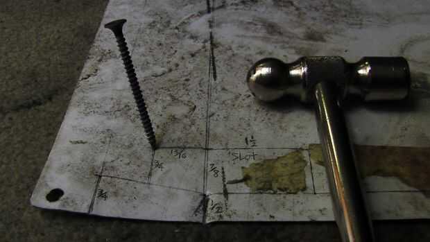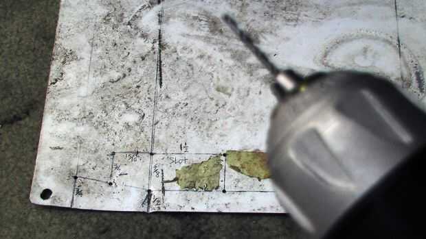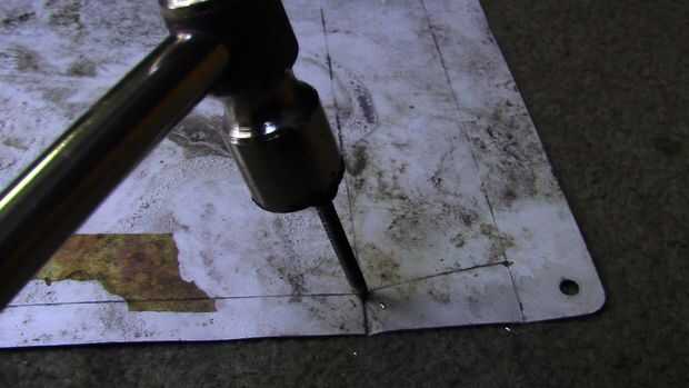 En las esquinas de donde los cortes cumplir, perfore pequeños agujeros para que el corte sea más preciso. Para hacer esto primero haga una mella en el metal con una lezna o el tornillo y el martillo.
