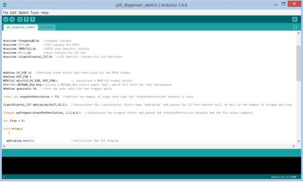 Ahora es el momento para programar el Arduino para que pueda funcionar el dosificador. Esto se logra escribiendo el código en el IDE de Arduino y incluyendo las bibliotecas de cada uno de los dispositivos utilizados para que palabras clave puede utilizarse para controlar cada dispositivo. Después entre las bibliotecas, los números de las patillas de selección reset y esclavo para el lector de RFID deben establecerse mediante la instrucción #define. Luego inicializar el lector de tarjetas y pantalla LCD, establecer la relación de transmisión para el paso a paso y pasar los números de pin de salida a la función de paso a paso. Entonces llegamos a la función de configuración, donde se enciende la luz de fondo para el LCD y se establece la velocidad para el paso a paso. El bucle principal, sigue inmediatamente que el programa comprueba constantemente para una nueva tarjeta RFID mientras se muestra "Escanear una tarjeta RFID" en la pantalla LCD. Si una tarjeta se lee correctamente, el motor paso a paso se ejecuta por 73 pasos que corresponde a una división en el volante y la pantalla LCD muestra "Dispensado". Una vez que el paso a paso termina funcionando, el programa regresa a la parte superior del bucle, donde el programa continúa verificación de tarjetas de RFID y LCD muestra "escanear una tarjeta RFID". En el video adjunto, se da una explicación completa del código donde se discute cada línea de código. También se adjunta el código, que se puede abrir en el IDE de Arduino y leer los comentarios para una mejor comprensión.