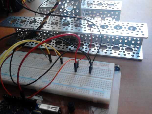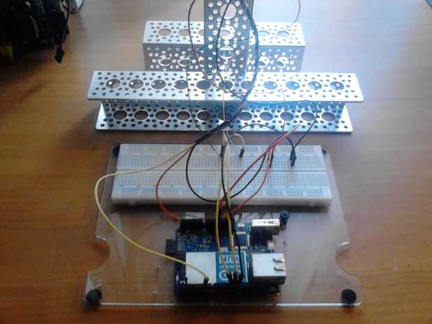 Es una buena idea tener diferentes colores para identificar cada cable. Conduzca los cables a un agujero diferente en la protoboard. Luego con jumper cables-macho puede conectarlos a la Yun. Otra vez de la placa a Yun que utilicé: