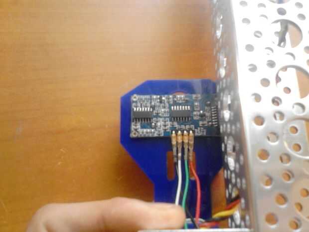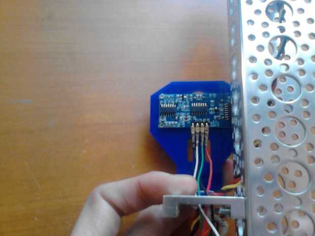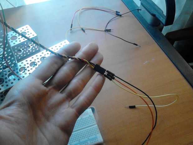 Primero hay que sumarle algunos viejos cables para conectar el sensor con el arduino. He utilizado algunos viejos cables de pc, si tienes los cables puente macho a hembra hará el trabajo. Conecte los cables a la parte posterior del sensor y conducirlos a la protoboard. La HC-SR04 tiene 4 cables: