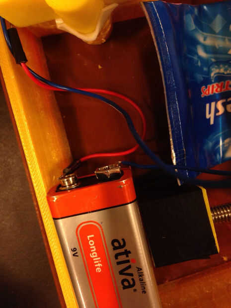 Bevestig nu reunió elektriciteitsdraden een batería aan het motortje, en plak de batería op het plexiglas. Zodra de draden dirección raken, gaat de motor draaien, en het verfrolletje gaat naar beneden. ALS je de tandpastatube en de dispensador plaatst, interfaz hier tandpasta uit.
