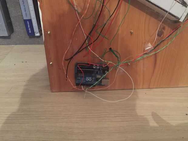Conectar el arduino a la parte posterior del panel y conecte los cables de los servos y de los botones en la parte frontal del panel