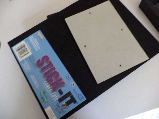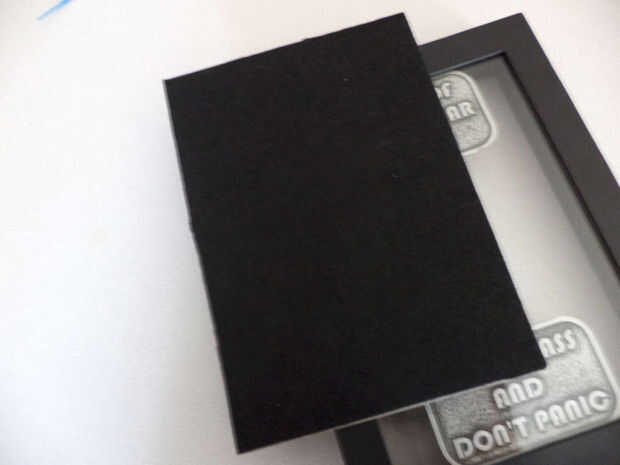 Para no distraer de las instrucciones que aparecen en las señales, me gusta mantener el fondo del shadowbox bonito un simple. Negro. Algunos shadowboxes ya tiene un buen fondo negro sólido. Si tu hace, salta este pedacito siguiente... Si no, siga leyendo... Si su shadowbox tiene un fondo inaceptable, puede ser fijado fácilmente con pelar-n-palillo sentía. Uso la espalda marcar el fieltro al tamaño correcto, corte, Pele, n, palillo.