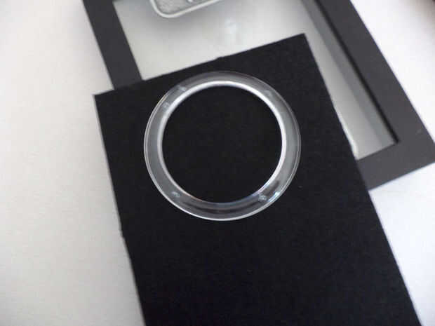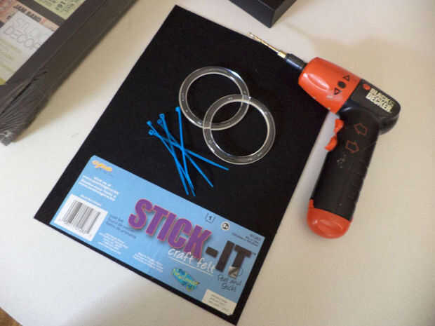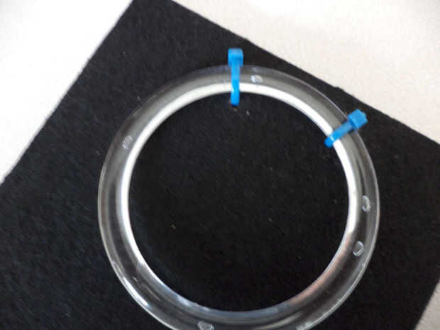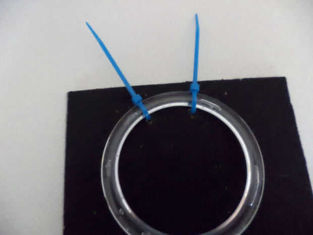 Ahora que el fondo es agradable y simple (para que no se distraigan de las instrucciones o la toalla), tiene que montar el anillo de toalla. El anillo debe estar centrado y la parte superior de la caja y debe montarse sólo en la parte superior del anillo. También debe montarse de manera que no interfiera con el cierre el shadowbox. Coloque el anillo de los agujeros detrás y marca permitir bridas envolver alrededor del anillo. Luego perfore los agujeros y pasar los lazos a través del frente, alrededor de la parte posterior y hacia arriba y sobre el anillo de plástico. Esto colocará las bridas 'cabezas' dentro de la caja y oculto por el signo superior. Apriete los lazos bastante apretados y corte apagado la cola sobrante.