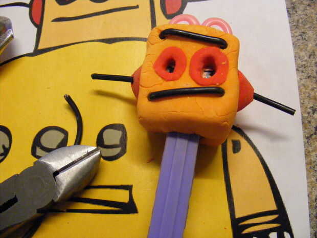 ¿Tomar un poco de arcilla roja y de la forma del Robot ojos y orejeras? Anillo alrededor de los ojos, ojo izquierdo más grande que el otro. Pegar las orejas a cada lado. Cortar pequeños trozos de cable para las antenas, monobrow y el mouthline. Doble forma de L en el extremo del alambre por lo que se pega en la arcilla mejor. La cabeza de Robot está casi listo para pegar las antenas en los oídos. Jugar con la colocación de la frente y la boca para obtener la expresión que desee. Creo que un alambre de calibre más delgado hubiera mirado mejor. También no puede utilizar alambre y solo tinta en tu Robot. "Tatoo" las cejas y los labios.