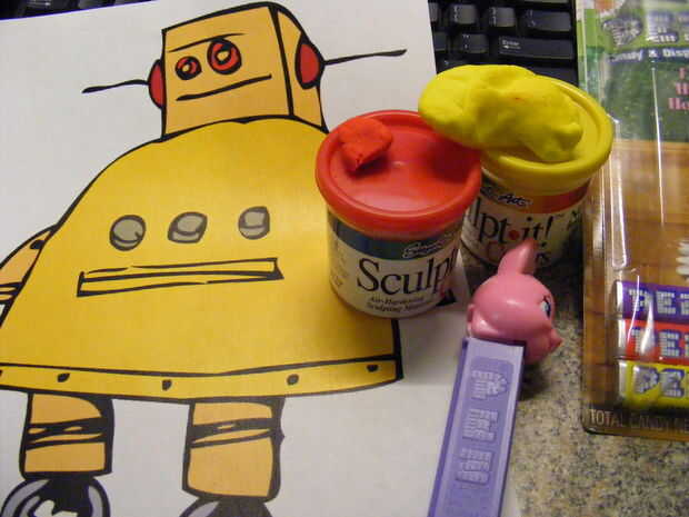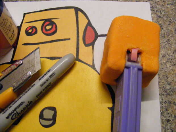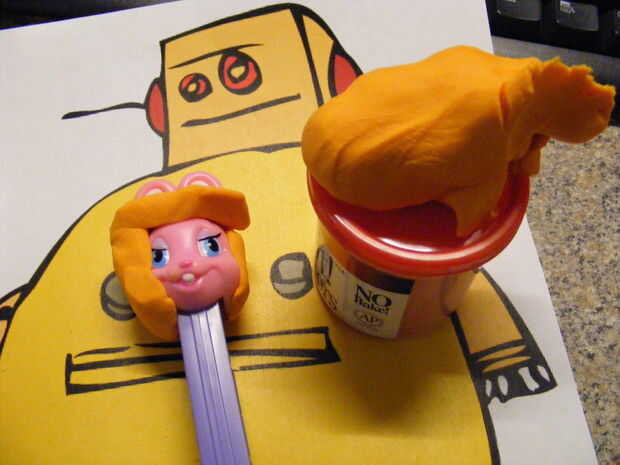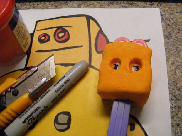 Pude hicieron un casting de cera de la parte principal del dispensador para replicar el diseño de pivote/empujador interno pero sacó la manera perezosa y decidió mod justo encima de la cabeza de depósito existente. La arcilla viene en envases pequeños en colores primarios. Usted necesitará mezclar diferentes colores para obtener la paleta derecha robot a utilizar. (Sugerencia: amarillo + un poco de rojo hace naranja :-)