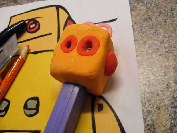 Mezclar algunos arcilla naranja y rellene alrededor de los ojos y el resto de la cabeza para hacer la forma de bloque. Este Robot tendrá un conjunto de orejas de conejo que sobresalen de la arcilla naranja.