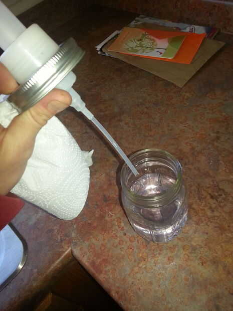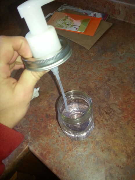 Después de taladrar un agujero en la tapa del tarro de masón probablemente tiene algunos bordes filosos en el agujero. Tomar una lima de metal para pulir los bordes. Hacen archivos de metal que se curvan para hacer más fácil rellenar hacia abajo de los bordes de ruff. Presentación de los es bastante recta hacia adelante llenar hacia arriba y hacia abajo. Esto puede dejar algunas piezas afiladas, asegúrese de tirar después de la presentación. También enjuague la jarra antes de agregar el jabón. Esto es donde usted puede pintar la tapa del tarro de masón o pintar el recipiente sí mismo. No pinto esto pero probablemente lo haré. en el futuro. Presione el dispensador de jabón lanzó el agujero que el dispensador esté ajustado. Asegúrese de empujar se lanzó desde el lado superior. Agregue el jabón para el tarro de masón.