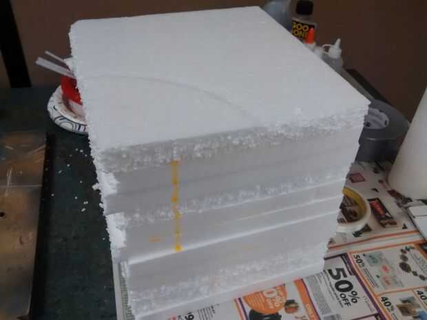 Para crear un bloque de espuma, sólo conseguir algunos espuma de poliestireno y unir hasta que quede un poco más grande que el tamaño aproximado tendrás la cabeza de la distribuidora a ser. Tenía algunos azulejos de 1/2" embalaje poliestireno ahí, así utilicé. I cortar los azulejos en azulejos de 10 "x 10" más pequeños y pegados en una pila. Puede utilizar cualquier espuma gustaría, pero si usted va la ruta que hice, estar preparado para un poco de trabajo extra. Embalaje de espuma de poliestireno se hace generalmente de espuma grande pellets molidos juntos. Cuando la arena y tallar esto, no hacen como incluso una superficie de trabajo como la espuma del aislamiento, o materiales similares.