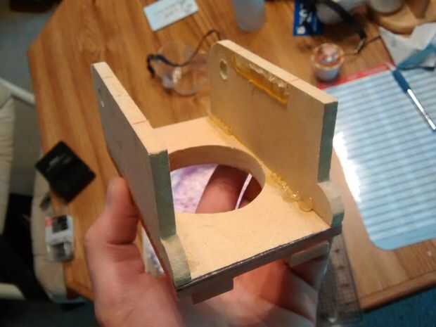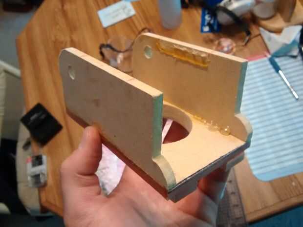 Para terminar la tapa, tomar la 5 "x 2" piezas MDF y perfore un orificio de 3/8" en el mismo lugar cerca de la esquina de cada uno. Péguela a la parte superior de la tapa de arriba. Puede redondear la esquina trasera de cada uno sobre el orificio perforado para un movimiento más suave. También puede cortar las muescas de la parte delantera para hacer más fácil agarrar la Copa K más adelante.
