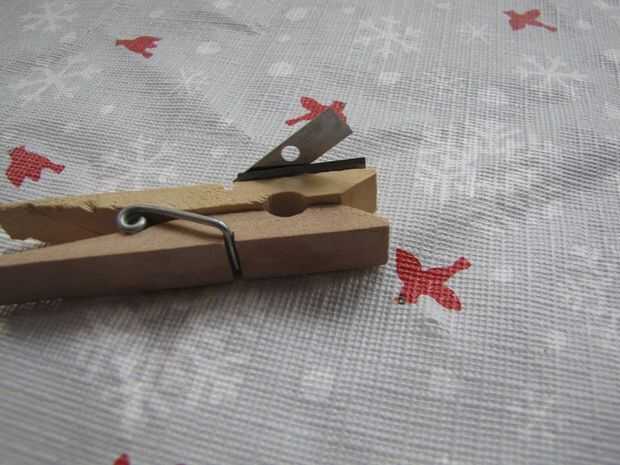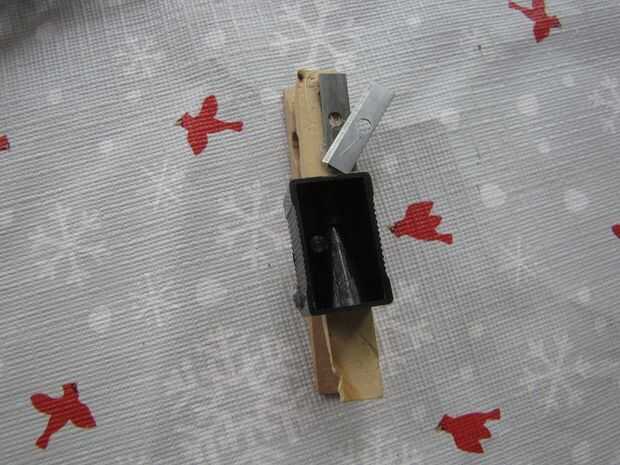 Luego, pegue uno de los sacapuntas en el mismo lado de la clavija de ropa como el cortador, pero hacerlo sobresalir de la manera opuesta (el cortador se pegue hacia arriba, y el afilador se pegue abajo).
