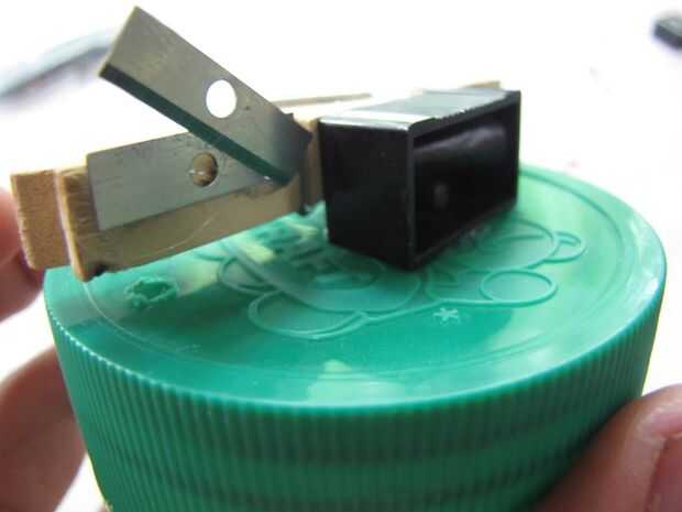 Por último, pegar la parte inferior de la carcasa de Afilador a la tapa de plástico para que la parte donde la ropa pin pizcas es directamente sobre el orificio en la tapa.