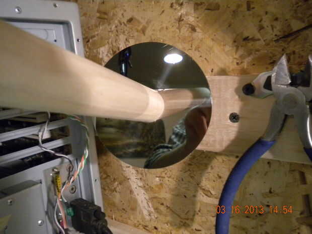 Deslice un plato de disco fijo re-purposed hacia abajo el pasador. Dejar algo de espacio al final para que el rollo de toalla de papel no entra en conflicto con (toque, haz arrastrado por) otros como artículos en el área de trabajo. Puede ajustar esta distancia según sea necesario. Nota: el plato del disco fijo re-purposed caben muy bien, que es lo que quieres. Trabajar en la varilla con paciencia.