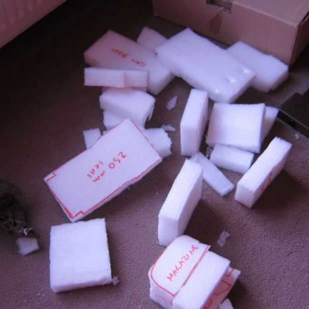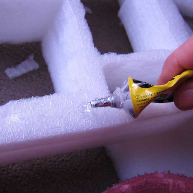 Pegar las capas con el pegamento de contacto. Espuma de polietileno no es afectada por el pegamento, pero si usas la espuma de poliestireno (styrofoam), el pegamento derrita lo.