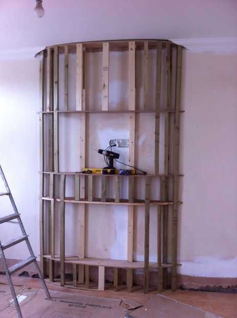 Usando una plantilla de cartón marcó la forma de la chimenea en la planta. Utilizando la plantilla creó algunas piezas curvas de madera laminada (freebie escuela) que forman los puntales principales. Entonces usé maderas el crear el resto de la estructura. He dejado dos huecos, uno para la TV y otro para el fuego.