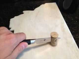1) encontrar un corcho y cortar 1/2 de la manera abajo representado. Asegúrese de hacer 'hot dog style' no 'estilo hamburguesa'. Aka: longitudinalmente.