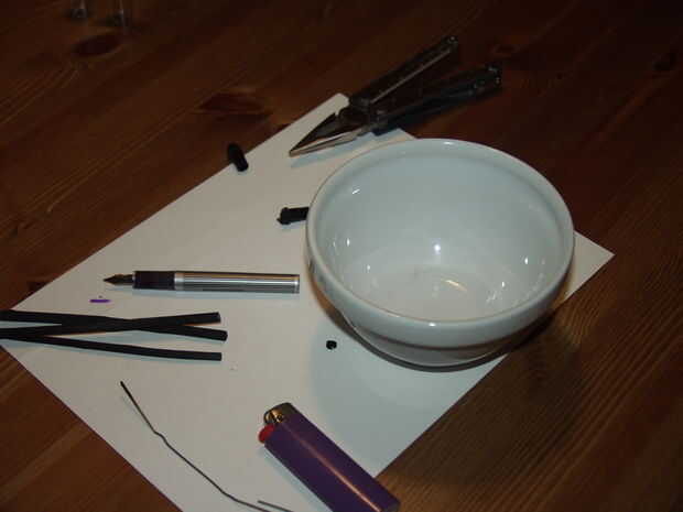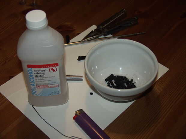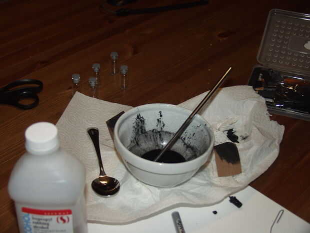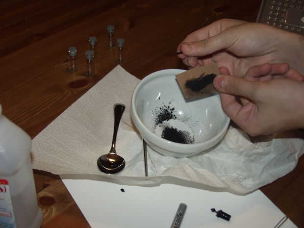 Para obtener el carbón en polvo, he utilizado un papel de lija que yo tenía por ahí. También se podría utilizar una combinación de mortero, pero no tienen uno ahora mismo. En este proyecto, queremos hacer la suficiente tinta para llenar la pluma, pero esto puede ampliarse bastante fácilmente. Una vez que el carbón de leña molido abajo, agregar suficiente alcohol para hacerla líquida y mezclar. Utilicé un palillo de metal para este paso, pero nada que no sea madera debería funcionar bien. (Asegúrese de no utilizar demasiado alcohol, porque no tiene suficiente viscosidad para alojarse en la pluma.)