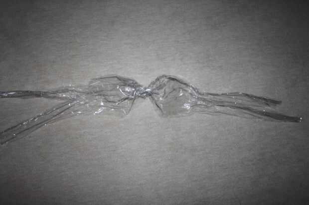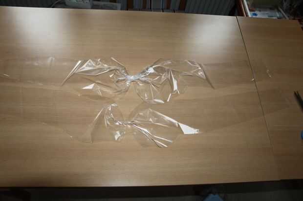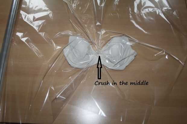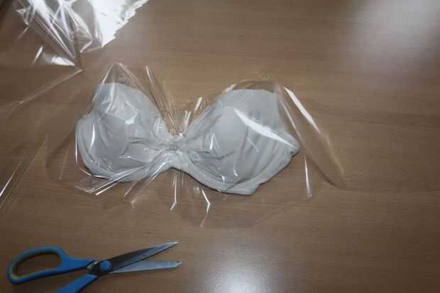Coloque el sujetador sobre la mesa, los lados doblados por debajo. Luego colocar el papel transparente sobre él, aplastar en el medio entre las dos tazas y pegar una cinta de cello. Luego corte una pequeña taza de tamaño más grande y continuar cortando dos bandas laterales a lo largo en ambos lados. Corte dos con el papel transparente.