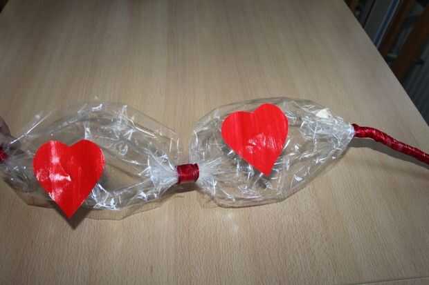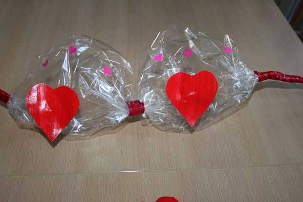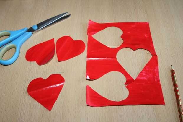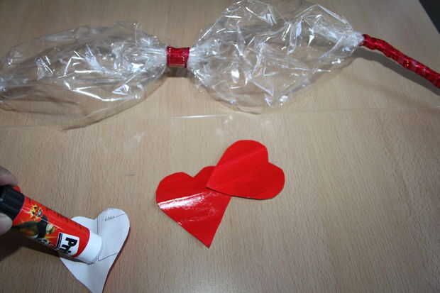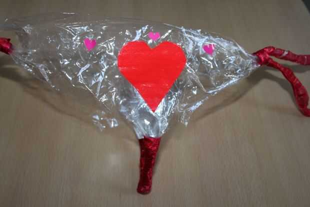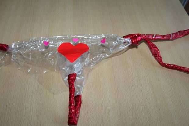 Cortar tres grandes corazones de papel rojo, palo dos en medio de las copas y uno en medio de la tanga de frente. Luego pegar unas pegatinas corazón pequeño rosa caliente.