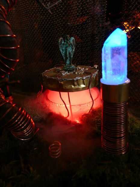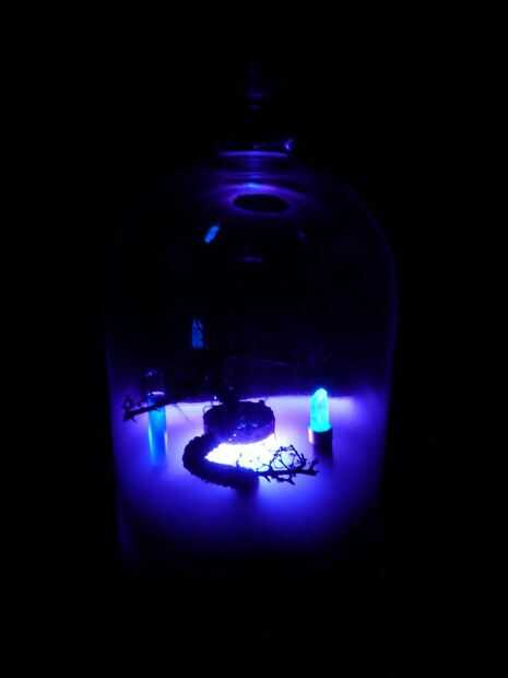 dispositivo de Sir Corvus de Aether Luminiferous (aka mi terrario steampunk). El vapor es generado por un atomizador de agua con LEDs que era de una vieja lámpara de Walmart. El cristal tiene un LED debajo de él eso se me quitan de una luz de noche baratos. El árbol es un viejo bonsai muerto (vive uno funcionaría pero me gustó muerto) que yo envuelto en alambre de cobre. Pensé en poner glowstick líquido en el tubo de ensayo, pero tendría que cambiar todo el tiempo, así que opté por llenar con agua y colorante azul. La base es en realidad una tartera y una lata de palomitas de maíz que pegan y cubierto de hoja de cobre amarillo. El resto fue creado de metal de hoja, alambre de cobre y encontrar piezas.