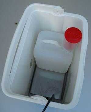 He intentado diferentes soluciones por adelantado – que fueron bastante decepcionantes. Entonces decidí construir un dispositivo de fermentación aislamiento térmico. Si desea utilizar 5l bidons tenga en cuenta que con el gas de drenaje y la calefacción por debajo de usted necesitan una caja aislante térmica alto. Tome uno que se construye para sostener botellas de pet de 1.5 a 2 litros.