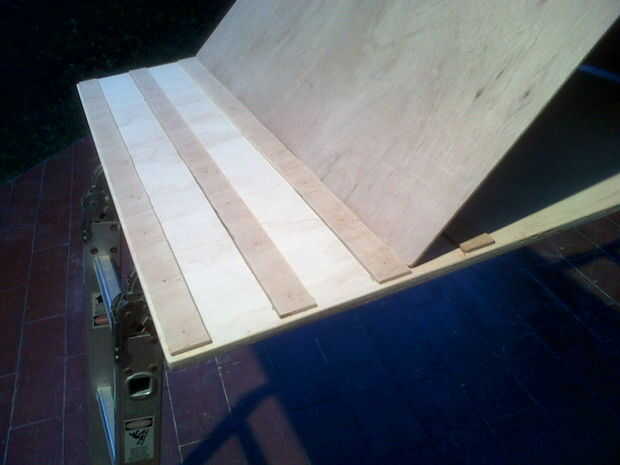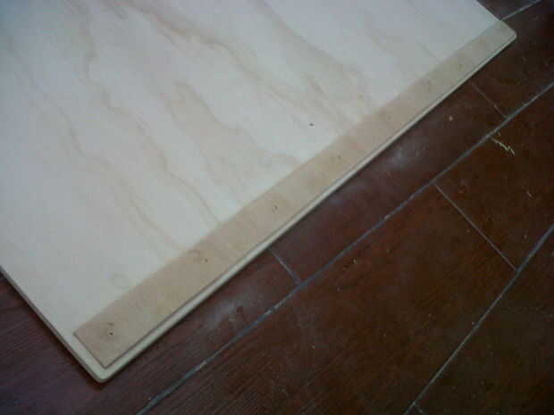 Aplique el pegamento a la tira siguiente de madera contrachapada y aplicar la tira en las marcas que acaba de hacer. Inserte los clavos como con la primera tira.