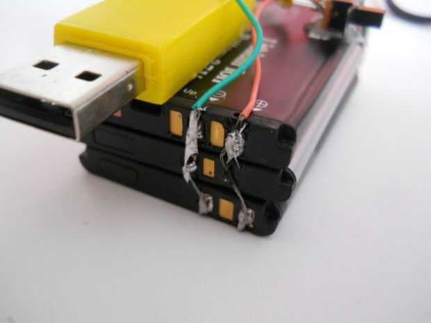 Unir las pilas rescatadas que silder en paralelo. Paralelo significa que Conecte cada positivo a positivo y cada negativo a la salida negativa. Después de este uso su cargador USB y carga de esta batería al igual que en la imagen 3. Volver a utilizar la pistola encoladora y completan el Banco de potencia. Probarlo en el teléfono de hacerlo impermeable también.