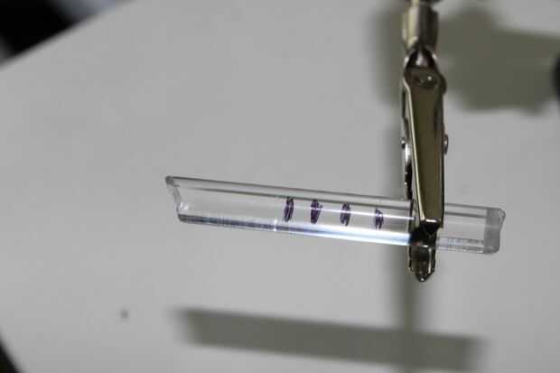 Si usas cera como yo, después de perforar los agujeros de 1/4 de pulgada, usted encontrará que las varillas de diámetro 1/4 de pulgada tendrá ajuste de dificultad. Para fijar este corte fin fuera una barra de acrílico en un ángulo y hacer marcas a la profundidad deseada (aproximadamente 1/2 pulgada). A continuación, inserte con un toque a afeitarse en dentro de las paredes del agujero para dar cabida a las varillas de acrílico. La herramienta se muestra en la foto de arriba. Después de hacerlo la barra debe tener un calce en el extremo de la longitud del afeitado.
