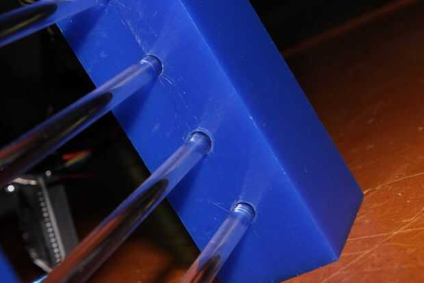 Para construir la vivienda utilicé dos bloques rectangulares de cera, que hace fácil la perforación. El material, espaciado y tamaño es arbitrario. Adjunto es un PDF de mi conjunto para arriba. Tenga en cuenta que este es el diseño original, al utilizar punteros láser todo en lugar de diodos láser. El extra 7/16 de pulgada agujeros perforados en el bloque de izquierda pueden ser ignorados si utiliza diodos láser. Las barras de acrílico son 6 pulgadas de largo.