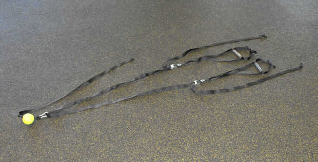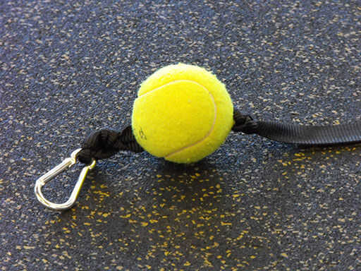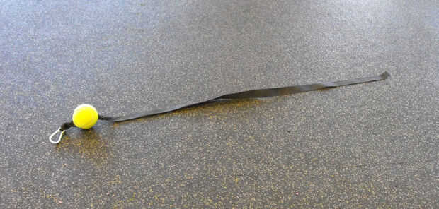 En primer lugar, haga un orificio a través de la bola y utilice un palillo de alambre o paletas para sacar un pedazo de trincajes sobrante a través de él. Coloque un mosquetón ligero a la bola y clip en el centro del dispositivo. Honda la pelota el ancla y la correa colgando para tirar hacia abajo (video).