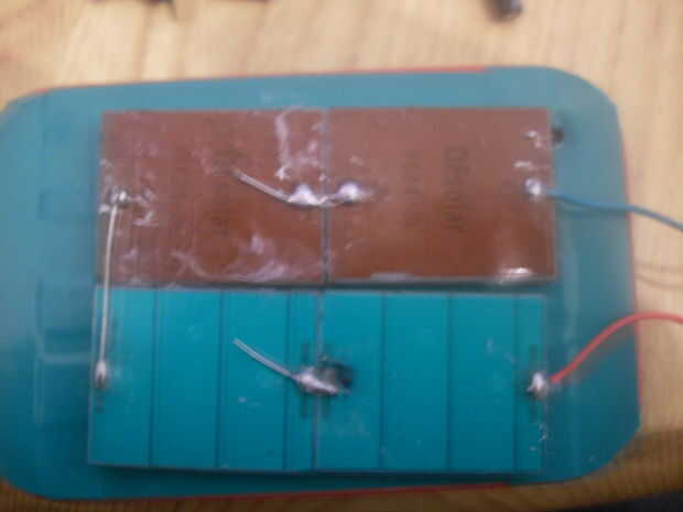 Soldadas las 3 baterías juntos y grabada todo juntos para proteger los empalmes de la soldadura conecta luego todo el la placa perforada